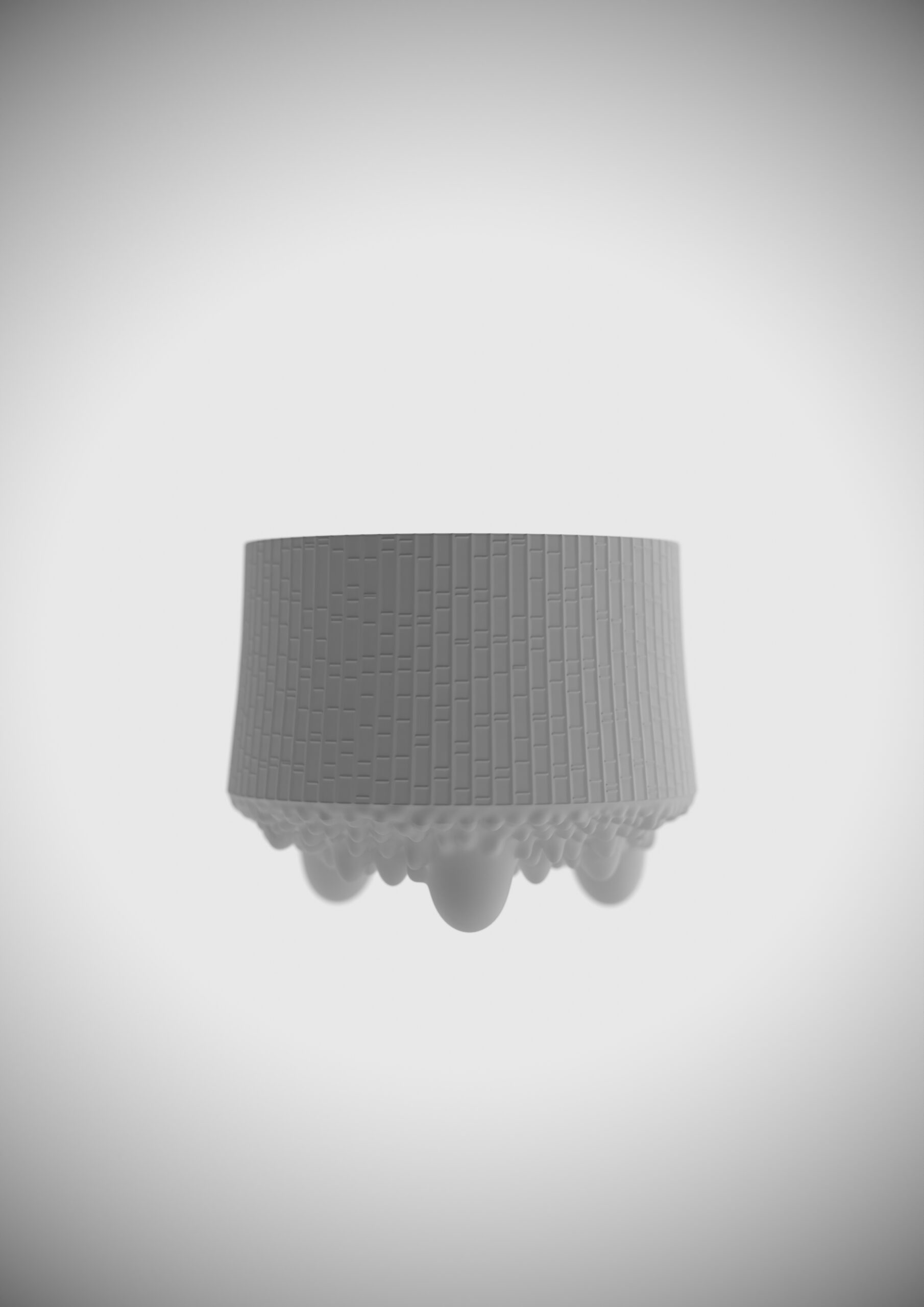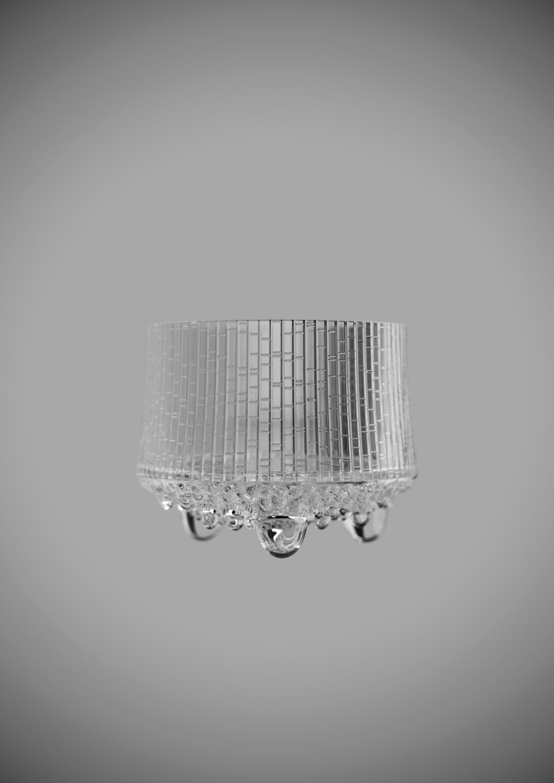 タピオ・ヴィルカラ《Ultima Thule》は、北方の氷雪が溶け落ちる瞬間の“境界”を、ガラスという素材の可塑性と光の挙動によって抽象化したシリーズである。その特徴は、自然現象が持つ不均質な凹凸と、融解による滴下のリズムを、工業生産で再現した点にあり、北欧デザインが重視する「自然観察に基づく造形思考」を象徴する作品群といえる。本制作ではProduct Visualization を目的とし、製品本来の魅力を最大限に引き出しつつ、実物の寸法精度と視覚的な説得力を両立させた表現を追求した。